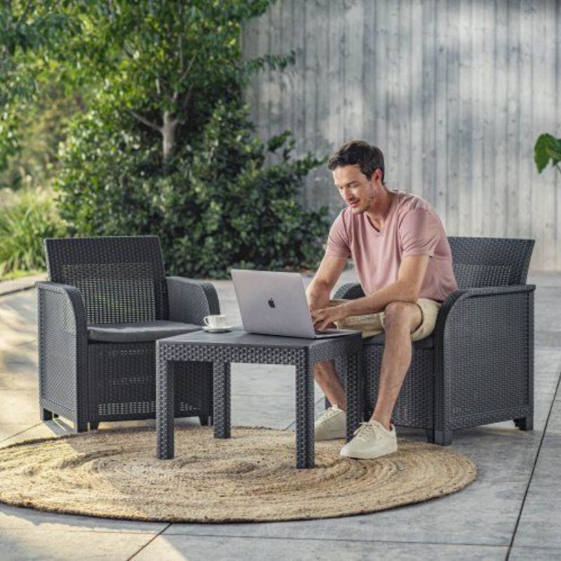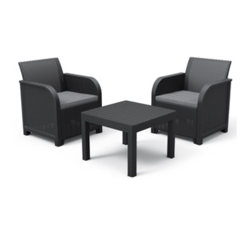 Rosalie është një komplet kopshti i rehatshëm dhe elegant, në te cilin perfshihen: dy kolltuqe, dhe një tavolinë.